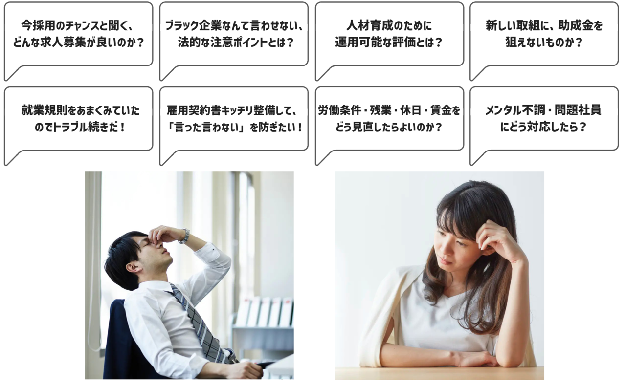 近年、中小零細企業に厳しい労働法の改正が続いており、労働者の保護はますます強化され、より経営者にとって難しい環境になっております。『ひと』かかわる経営者の悩みは、深くて重いものです。